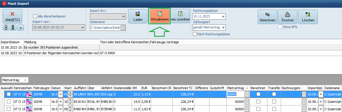 Verlassen Sie den Vertrag per Klick auf OK. Danach muss die Mautliste aktualisiert werden.image-1699618598876.png