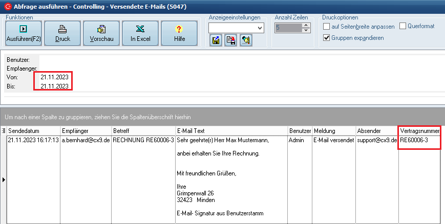 Die versendeten Mails können Sie in der Abfrage Controlling > "Versendete E-Mails[5047]“ einsehen.