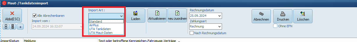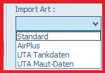 Wählen Sie im Drop-Down-Menü zwischen „Standard“,„AirPlus“ und „UTA Maut-Daten“. (UTA Tankdaten -> siehe Anleitung "UTA Tankdaten").