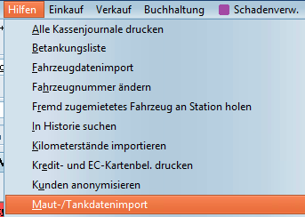 Um den Mautimport zu öffnen, wählen Sie „Hilfen“ Mautimport.