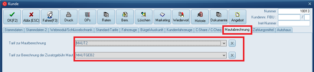 In den Kundendaten wurde hierzu die Eingabe von Raten für die Mautabrechnung durch eine Auswahlbox ersetzt (ab Rel 6.25.1).