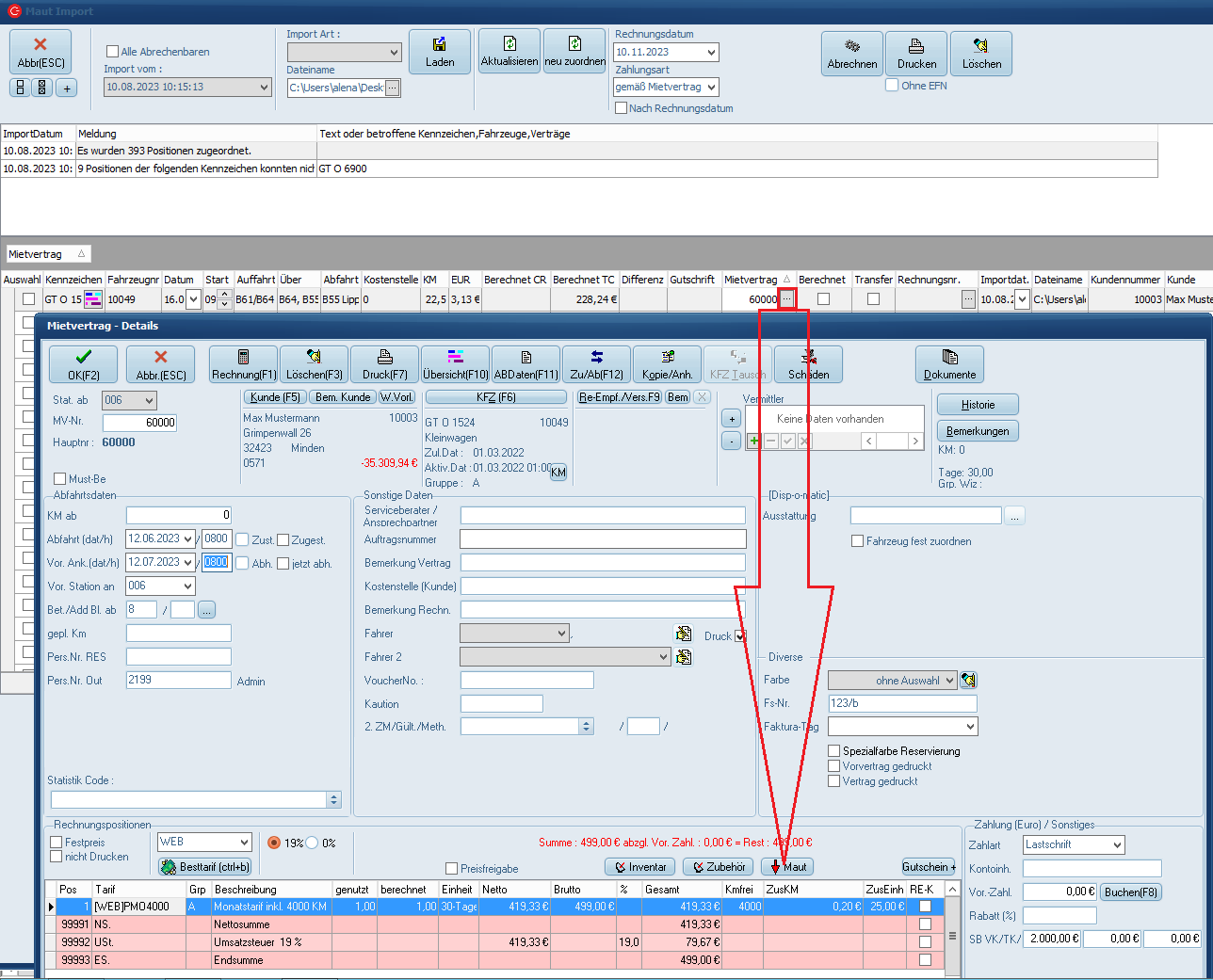 Alternativ kann die Maut auch in den Mietvertrag übertragen werden. Die Abrechnung erfolgt dann über die Rechnung im Mietvertrag und nicht in einer gesonderten Rechnung über den Lauf. Lesen Sie wie gewohnt die Mautdatei ein, so dass die Mietverträge den Vorgängen zugeordnet werden. (Der Vorgang darf natürlich noch nicht abgerechnet worden sein.)