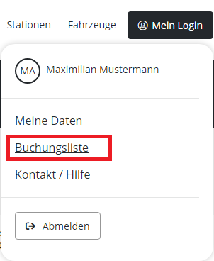 Nach erfolgreicher Anmeldung wir der Button "Mein Login" angezeigt. Hier finden Sie auch die Buchungsliste.