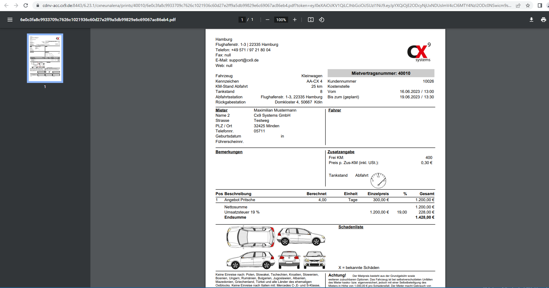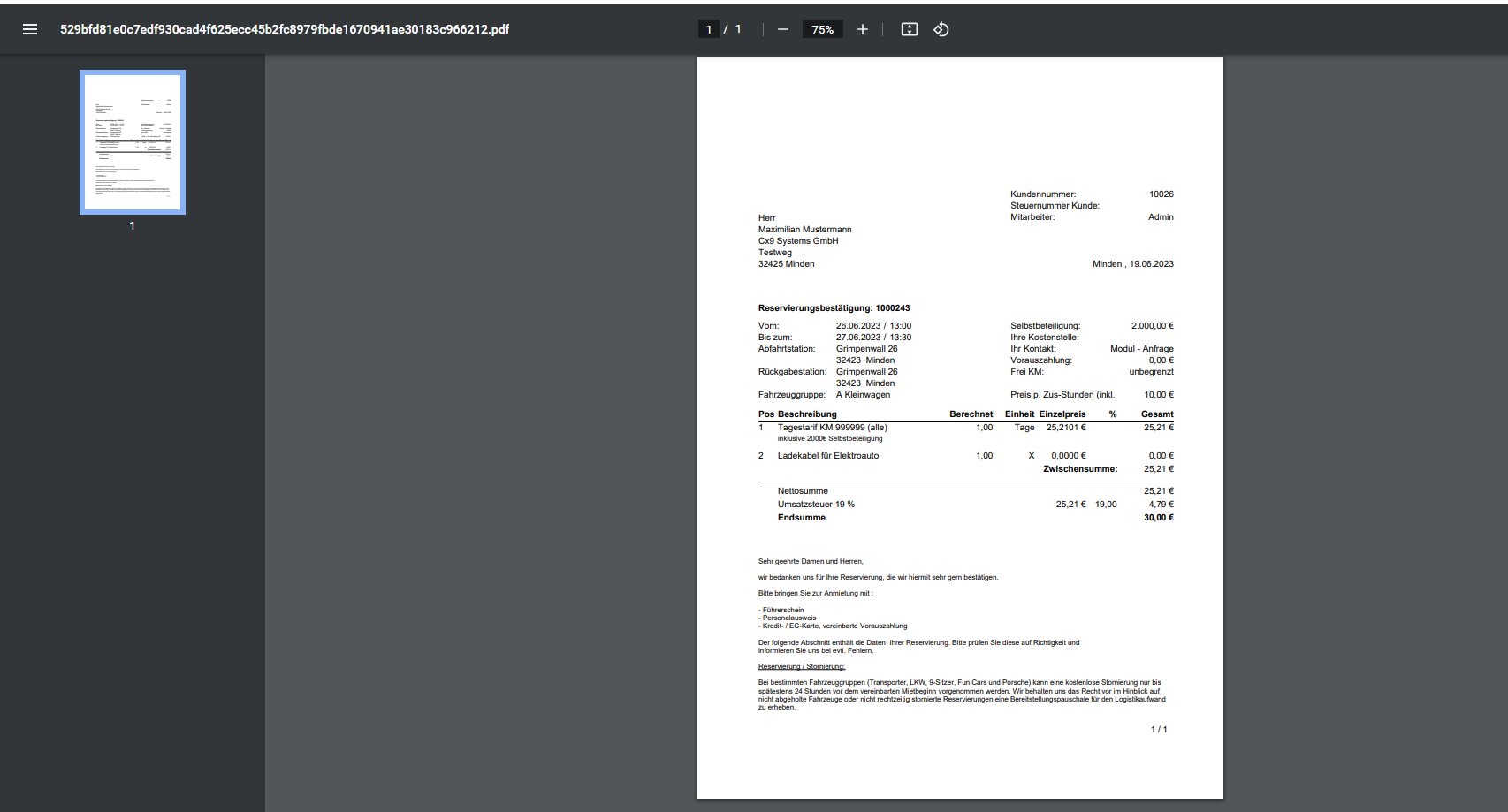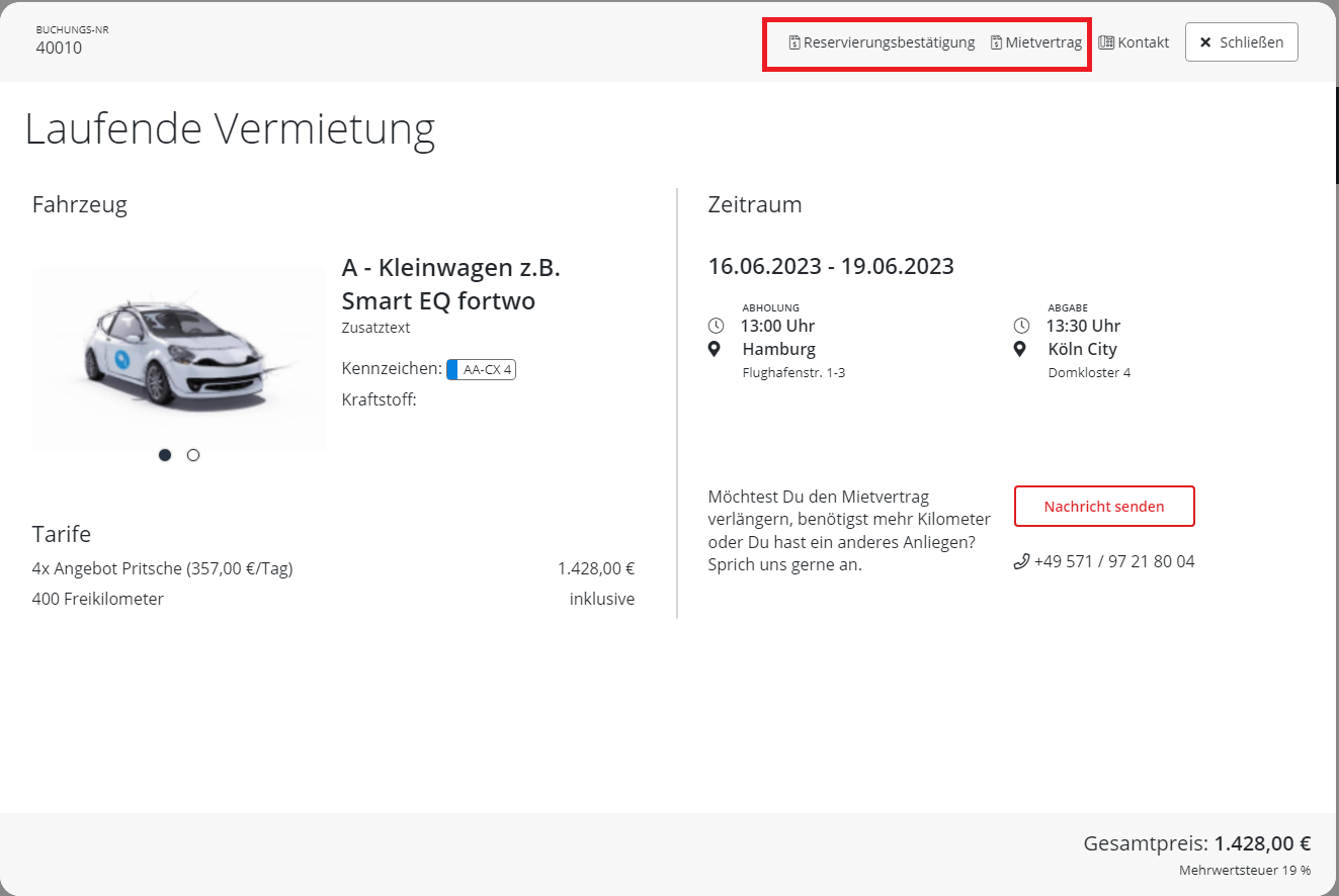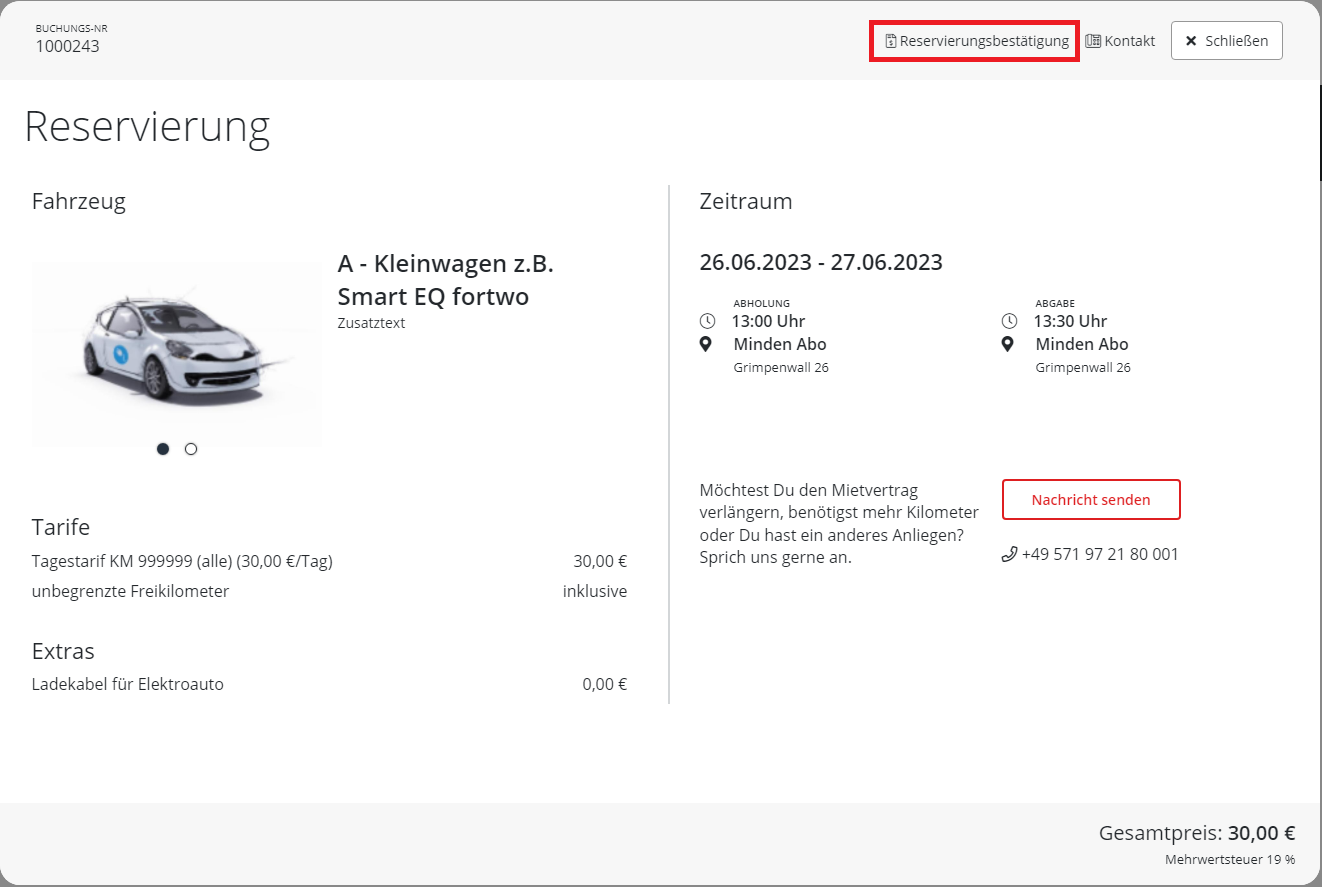 Bei Klick auf "Reservierungsbestätigung" oder Mietvertrag wird der entsprechende Ausdruck in einem neuen Tab geöffnet.