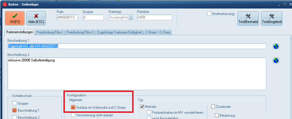 • Die Einstellung der Angebote im C-Rent erfolgt über Stammdaten > Tarife > Angebote Website. Damit ein Tarif hier zur Auswahl bereit steht muss der Haken „Nutzbar im Webmodul und C-Share“ gesetzt sein.  image-1676468091087.png