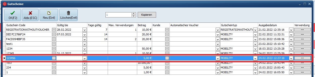 Ein Gutschein mit Euro-Betrag wird über den Gutscheintyp "MOBILITY" erstellt, der Betrag wird in die Spalte „Betrag/Rabatt“ eingetragen.