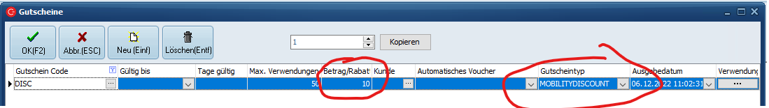 Ein prozentualer Gutschein wird über den Gutscheintyp "MOBILITYDISCOUNT" gesteuert, die Prozente werden in die Spalte „Betrag/Rabatt“ eingetragen.