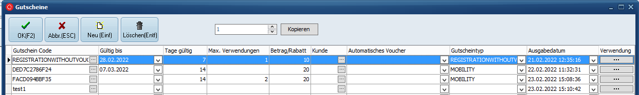 - Bleibt das Feld leer bei GS TYP "MOBILITYDISCOUNT" und ohne Kundenzuordnung dann kann der GS unendlich oft verwendet werden.