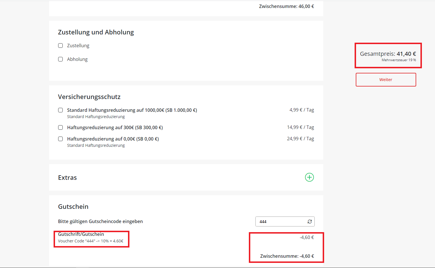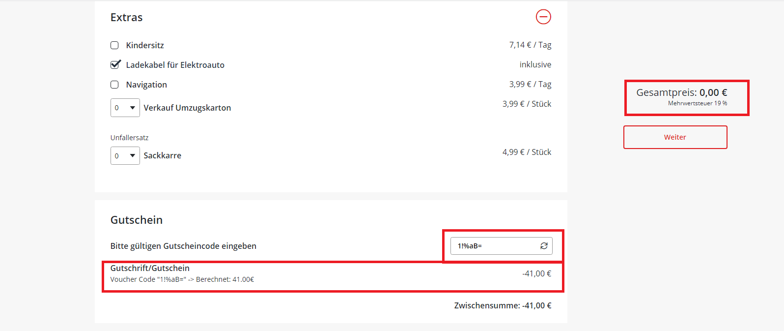 > Der Gutschein wird bei einer Miete unter 50€ Wert eingelöst. Der Gutschein wird anteilig berechnet und angezeigt: