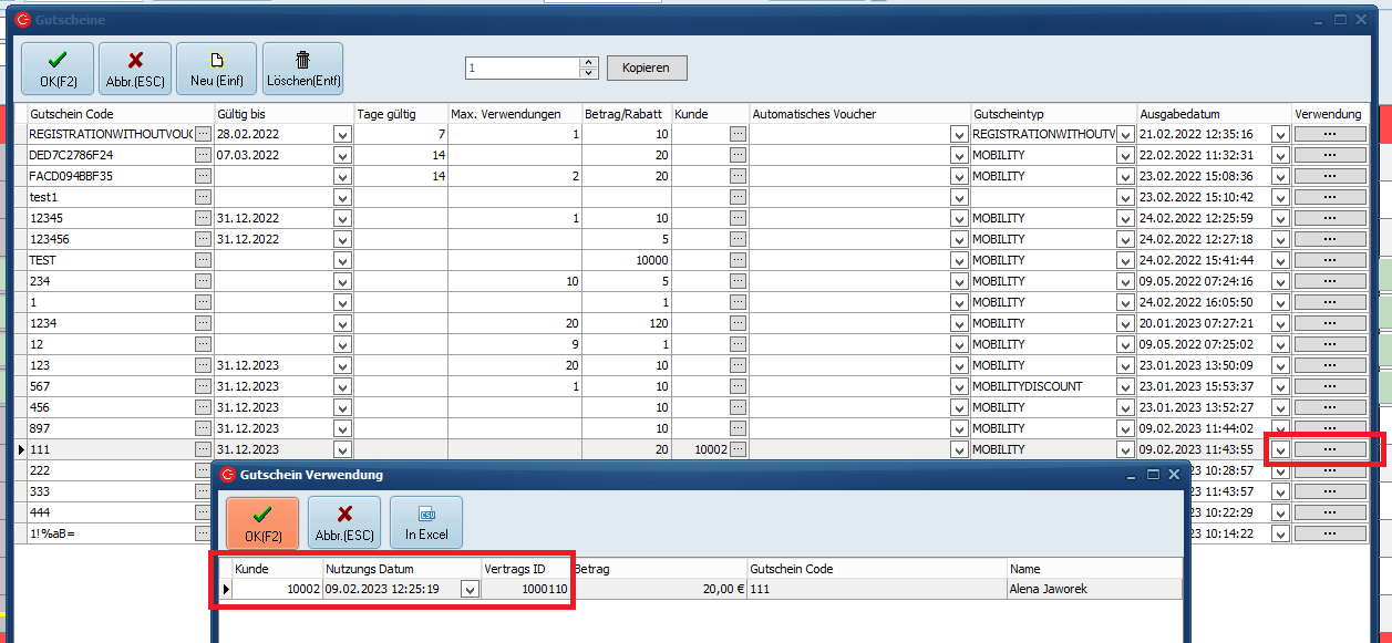 gelangen Sie in die Maske "Gutschein Verwendung". Hier wird Ihnen angezeigt in welchen Vorgängen, von welchen Kunden die Gutscheine wann und in welcher Höhe eingelöst wurden. Der eingelöste Gutscheinbetrag kann auch kleiner als ausfallen. Beispiel, Gutschein über 20€ wird für eine Miete eingelöst, die nur 18€ beträgt. Wird ein Vertrag oder eine Reservierung mit Gutscheinsode gelöscht verschwindet der Eintrag aus dieser Liste.