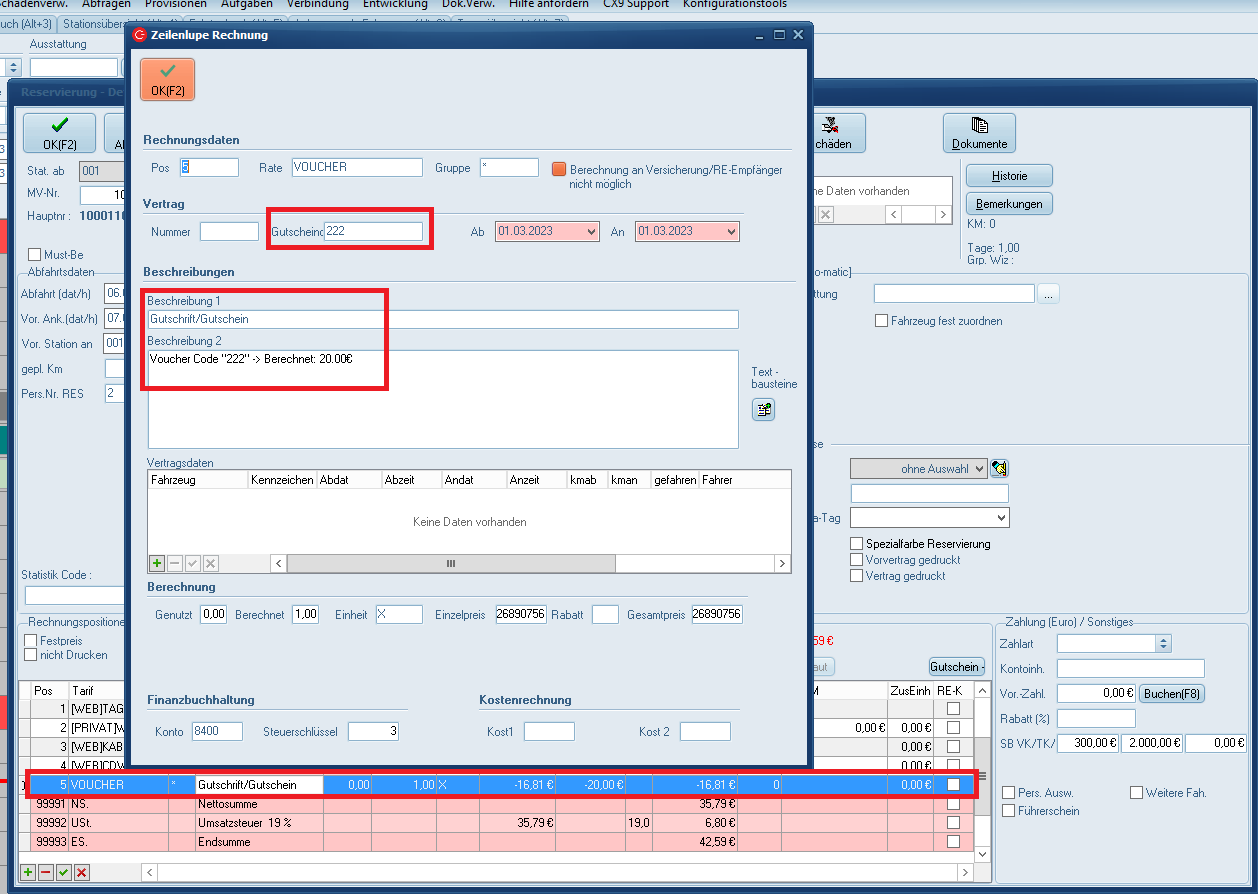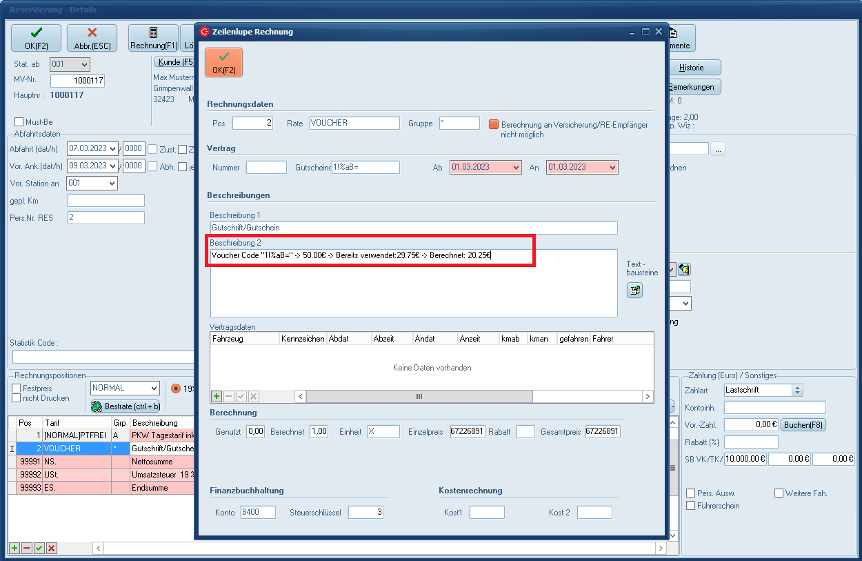 In der "Zeilenlupe Rechnung" wird die verwendete Gutscheinnummer im entsprechenden Feld angezeigt. In der Beschreibung 2 finden Sie Informationen zur Berechnung.