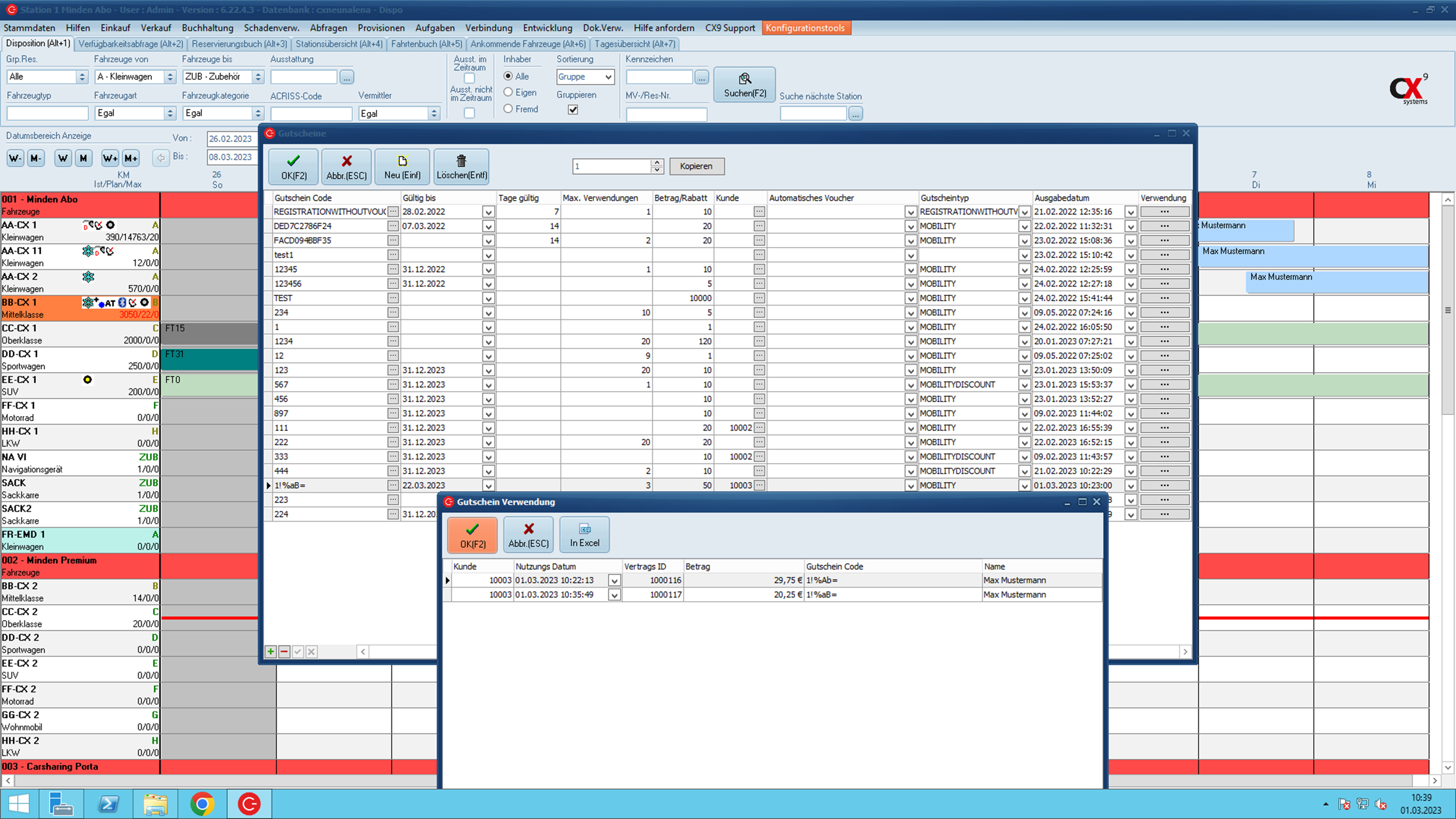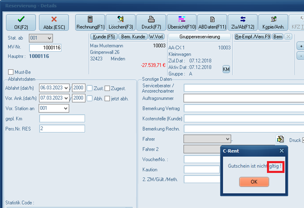 Gebe ich den GS aber erneut in C-Rent ein passiert nix. Es kommt kein Fehler, aber der Tarif Voucher wird auch nicht eingefügt. Nur der Button GS sieht so aus da hier nun „Gutschein-„ angezeigt wird. (liegt vermutlich daran, das „max Verw.“ auf 3 steht, aber im ORM LF wird es korrekt erkannt. Und man weiß ja vorab nicht in wie vielen Verwendungen ein Kunde einen GS einlöst)