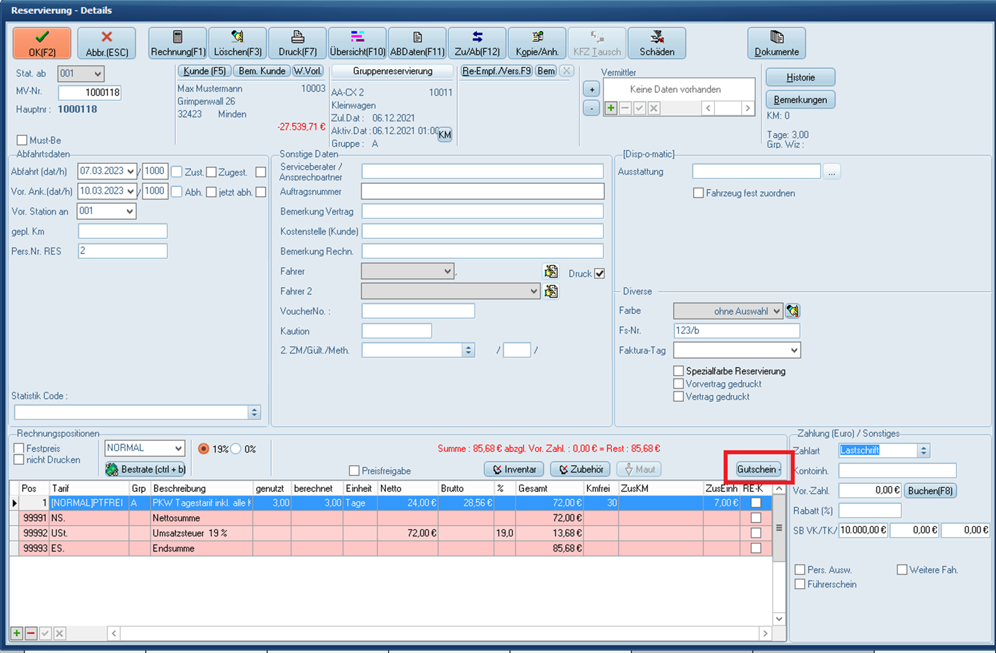 Manuelle Eingabe eines Gutscheines in C-Rent
