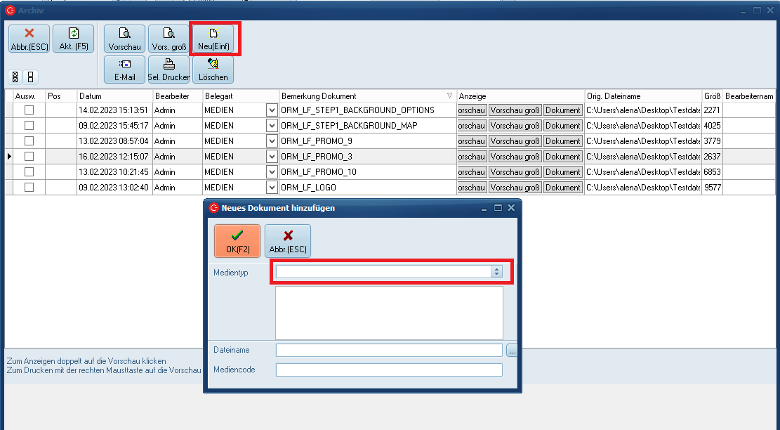Per Klick auf den Button "Neu(Einf)" gelangen Sie in die Maske "Neues Dokument hinzufügen":
