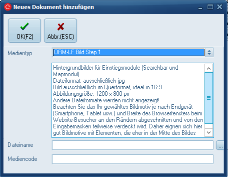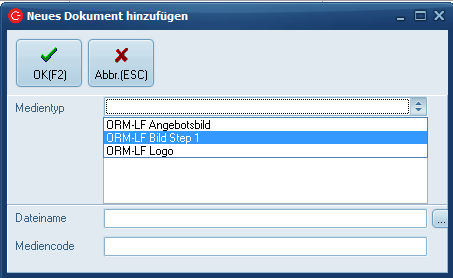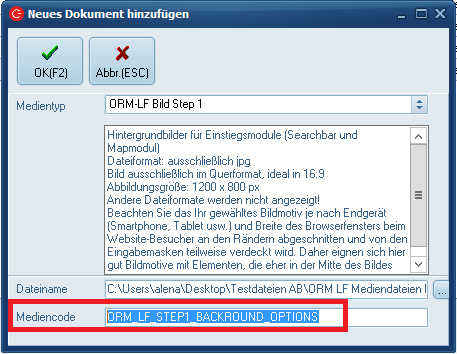 Als nächstes befüllen Sie den Mediencode (hier z.B. ORM_LF_STEP1_BACKGROUND_OPTIONS) und bestätigen die Eingabe mit OK.