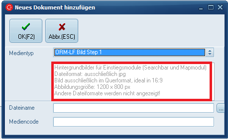 Medientyp „ORM_LF Logo_SPARTE“Mediencode fürauf denEintragButton "Neu(Einf)" gelangen Sie in dieSpalteMaske "BemerkungNeuesDokument"Dokument hinzufügen":ORM_LF_LOGO_“SPARTE“