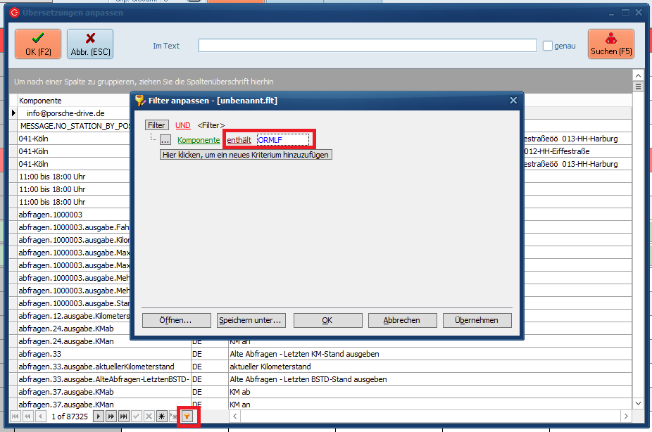- Option 1: Klick auf Filter in der unteren Zeile, die Angaben wie auf dem Screenshot über das Pop-Up und das Textfeld eingeben und OK drücken