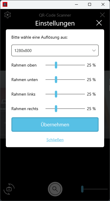 - Der Rahmen kann im Scan-Vorgang dazu verwendet werden, den Bereich in dem nach einem QR-Code oder Text gesucht werden soll einzuschränken. Dies kann bei höheren Bildauflösungen zu einem Performance gewinn führen.