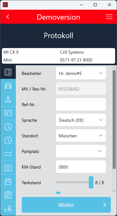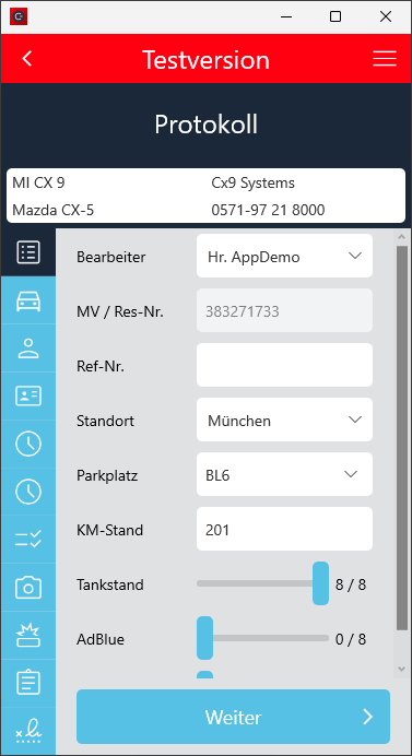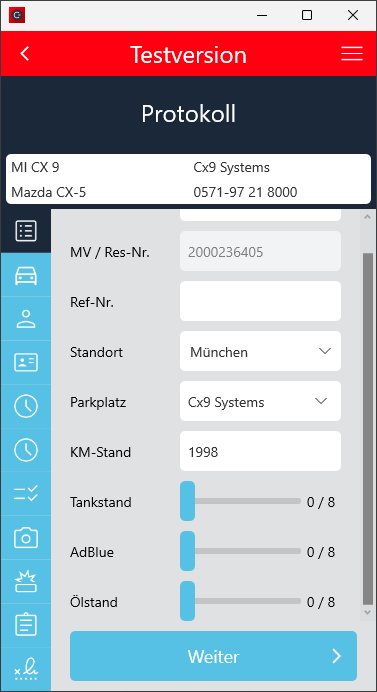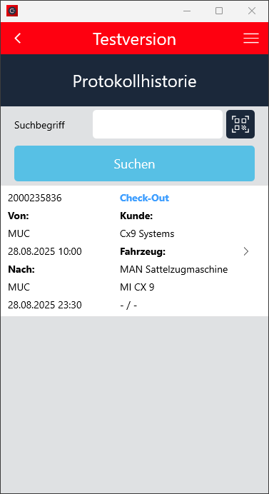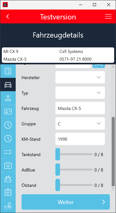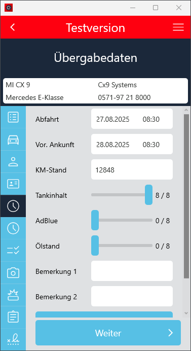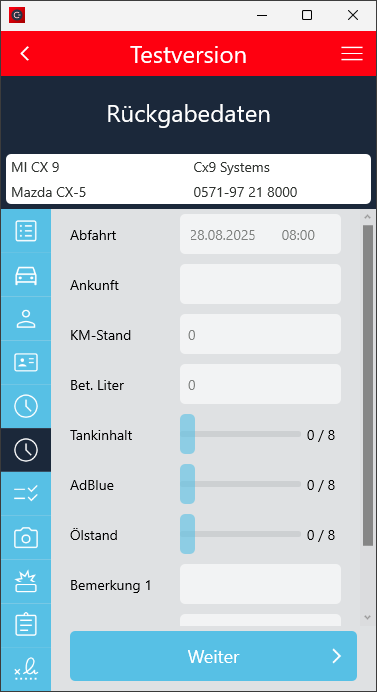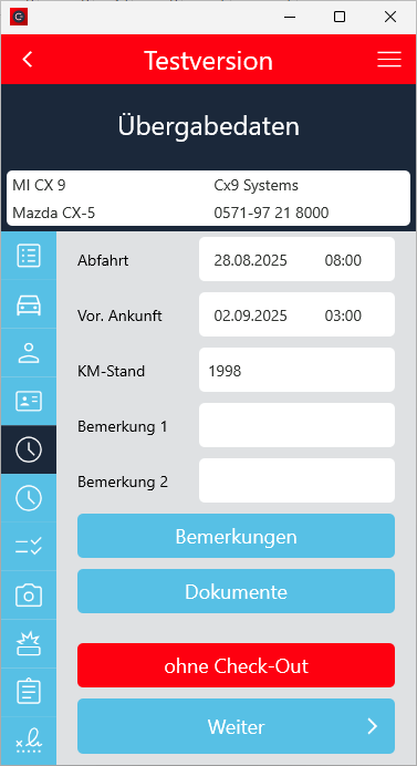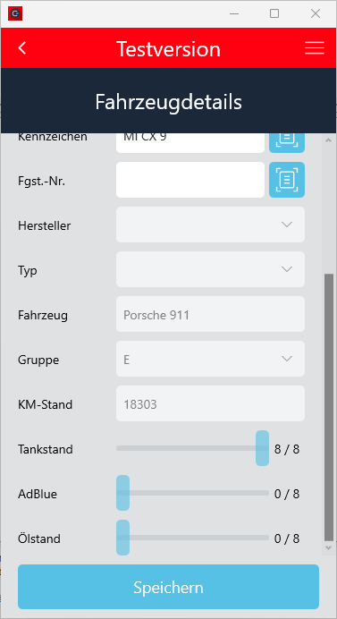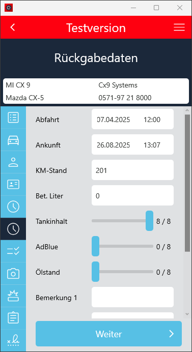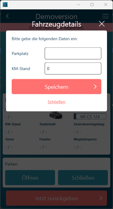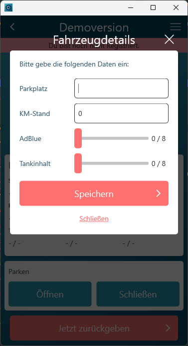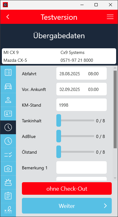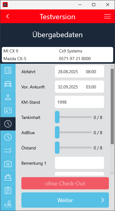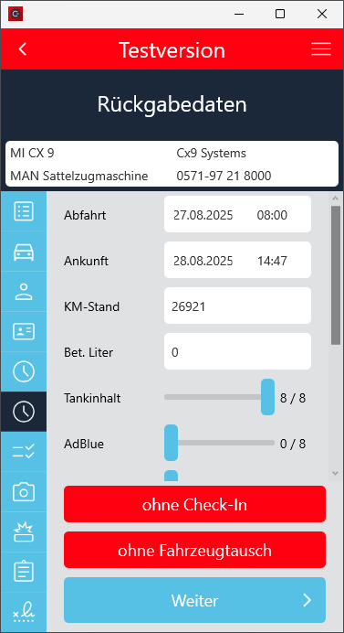 Der Check-In Vorgang wurde so angepasst, dass der Ankunftskilometerstand mindestens dem Abfahrtskilometerstand entsprechen muss, wenn die Fahrzeugdetails manuell eingegeben wurden.