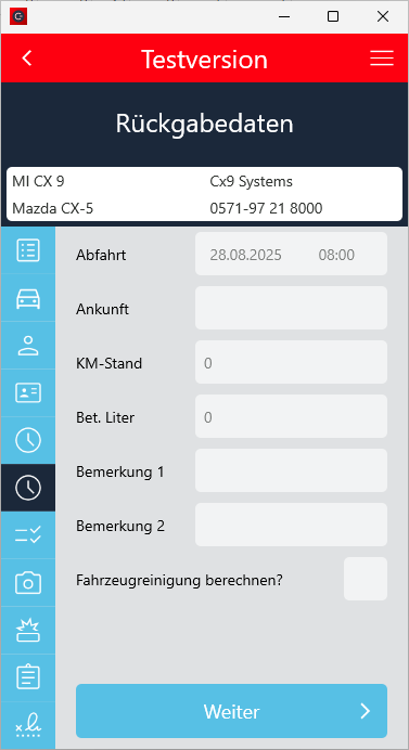 Die Steuerung zur Anzeige des Check-In und Fahrzeugtausch Buttons wurde in der Maske "Rückgabedaten" angepasst: