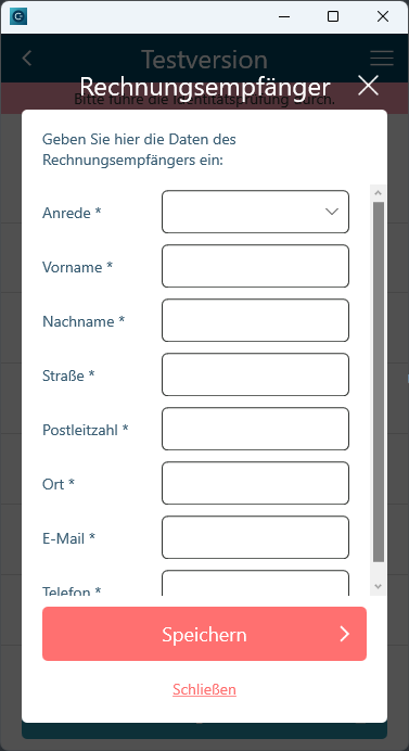 Es wurde unter "Menü -> Meine Daten -> Rechnungsempfänger" eine neue Maske angelegt, über die der Benutzer wenn der Parameter "BCSAPP_INVOICERECEIVER" aktiv ist, einen neuen Rechnungsempfänger anlegen kann.