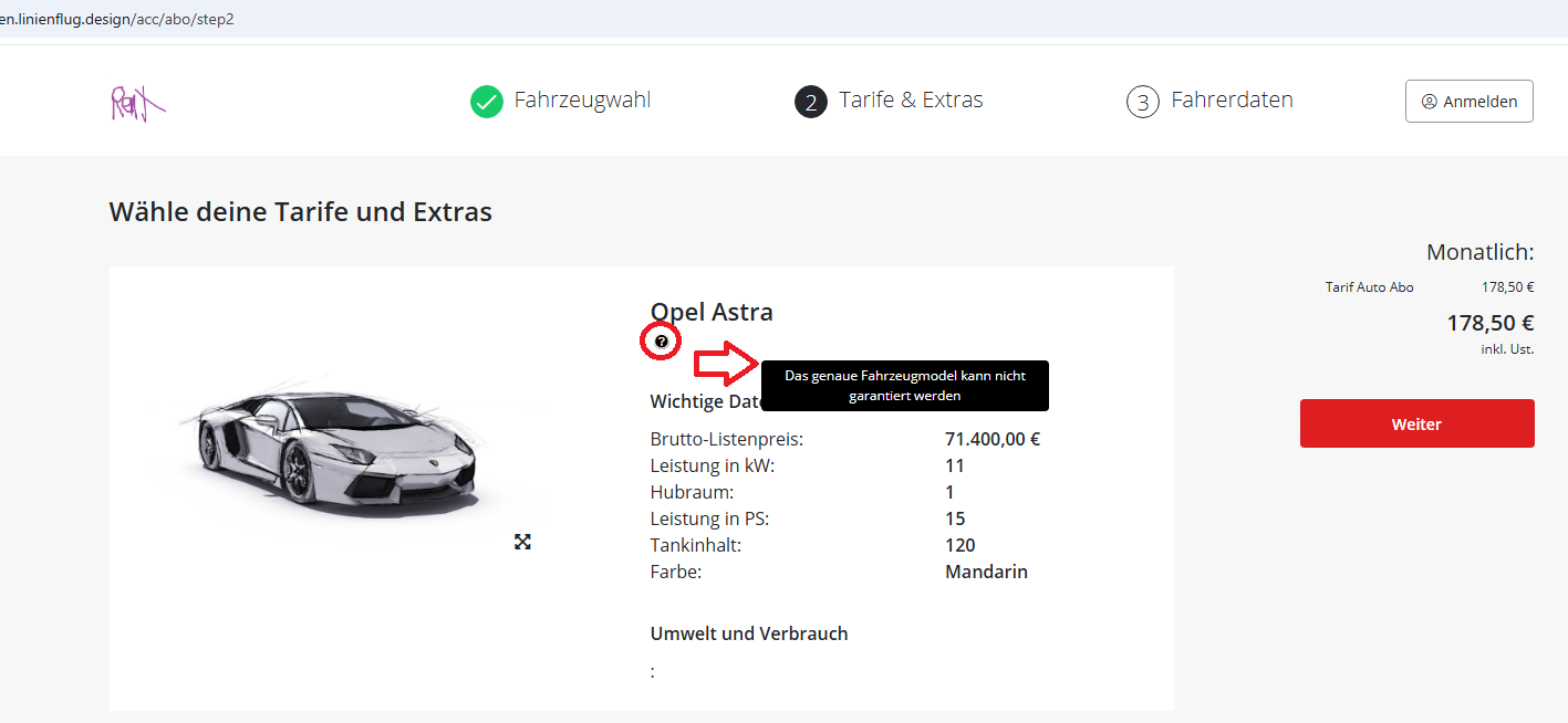 1151193 Es wird der Hinweis „Das genaue Fahrzeugmodell kann nicht garantiert werden" im Auto-Abo Step 2 angezeigt, wenn man über das ? fährt.
