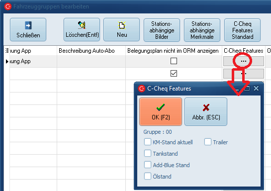 Die Felder zur Anzeige des AdBlue-, Öl-, Tank- und Kilometerstandes werden in den Fahrzeugdetails ausgeblendet, wenn sie über die Fahrzeuggruppenfeatures entsprechend deaktiviert wurden.Screenshot Screenshot Handling im C-Rent: Maske Fahrzeuggruppen, in der Spalte "C-Cheq Features" kann eingestellt werden welche Features bei Check Out und Check In abgefragt werden.
